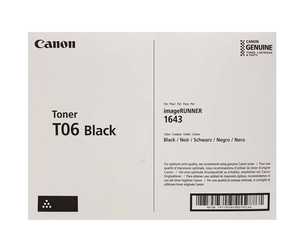 Оригинальный тонерный картридж Canon T06 Black - резервуар заполненный Черным Сферическим Тонером. Тонер позволяет получить разрешение печати до 1200 x 1200 точек на дюйм - обеспечивает высокое качество печати текста и графики с высокой детализацией. При установке Картриджа следует соблюдать инструкцию по распаковке и установке Картриджа Кенон T06 Black в принтер или МФУ. Не стоит прикасаться руками и сторонними предметами к поверхности чипа и фотобарабана картриджа. Для успешной эксплуатации, необходимо аккуратно установить картридж в принтер не повредив его. Ресурс Картриджа составляет около 20500 страниц при 5% заполнении листа А4. Картридж 3526C002 Black предназначен для использования в следующих печатающих устройствах: Canon I-Sensys iR: 1643, 1643i, 1643iF Производитель Canon.