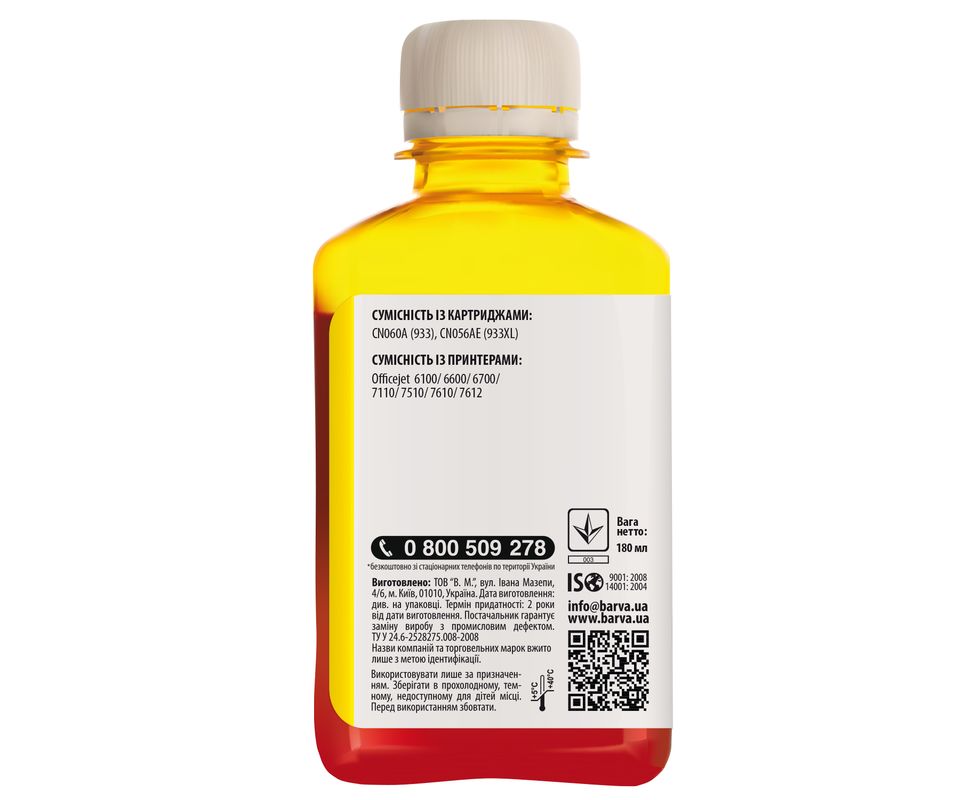 ЧЕРНИЛА BARVA HP 933/933XL (OfficeJet 7110) YELLOW 180 мл ПИГМЕНТ (H933-723) описание