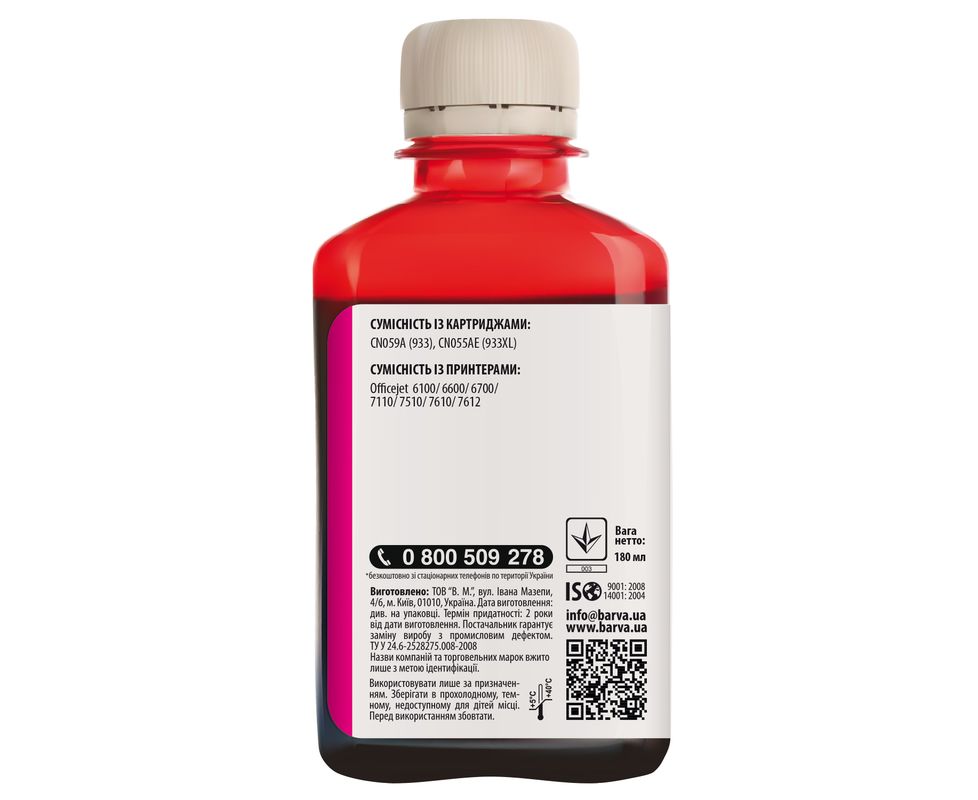 ЧЕРНИЛА BARVA HP 933/933XL (OfficeJet 7110) MAGENTA 180 мл ПИГМЕНТ (H933-722) описание
