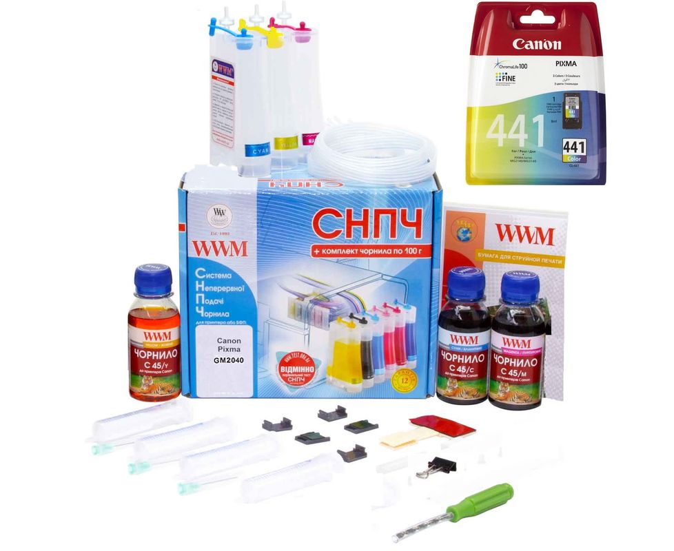 Данная Система Непрерывной Подачи Чернил предназначена для принтера Canon Pixma GM2040 устанавливается на оригинальный картридж Canon Cl-441, который входит в комплект поставки. Комплектация: - гарантийный талон, - чернила С45 C, M, Y по 100 г каждого цвета; - емкости-доноры постоянного давления; - силиконовый шлейф; - воздушные фильтры; - держатели шлейфа; - шприцы; - инструкция по установке СНПЧ; - фотобумага WWM глянцевая 100х150 мм, 5 л.