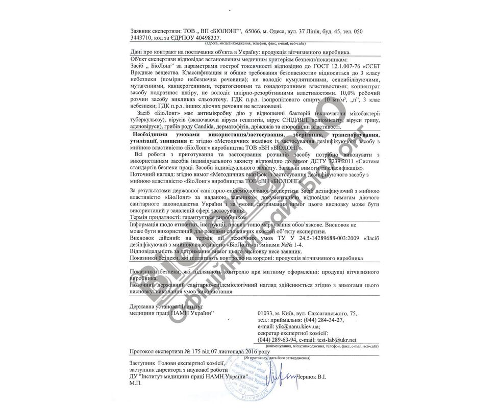 Виробник: BIOLONG Кількість: 1000мл Фасовка: Кришка Застосування БіоЛонг Концентрат Засіб призначений для проведення поточної, профілактичної та заключної дезінфекції на всіх об’єктах, які підлягають санітарному нагляду: медичних, лікувально-профілактичних та оздоровчих закладах; косметичних та перукарських салонах; дитячих та учбових закладах; підприємствах фармакологічної, парфумерної, харчової та харчопереробної промисловості; закладах сфери обслуговування, громадського харчування, торгівлі, на ринках; автомобільному, авіаційному, залізничному та громадському транспорті; в громадських установах, готелях; у вогнищах інфекційних захворювань; для дезінфекції лабораторного обладнання, медичного, стоматологічного, косметологічного та перукарського інструменту; предметів догляду за хворими, посуду, білизни, виробничих ліній, систем вентиляції та кондиціювання, медичного та оздоровчого обладнання, предметів побутового використання, вікон, меблів, взуття та одягу; миття любих поверхонь, які є джерелом вірусної, грибкової та бактеріологічної небезпеки. Склад засобу Вода ІПС ЧАС від 5% до 15%. Не містить хлору, фосфатів, кислот, абразиву. Не викликає алергію. Застереження при використанні У разі попадання в очі ретельно промийте їх великою кількістю води. За потреби зверніться до лікаря. Зберігайте в сухому місці при температурі від +5 до +40°С, окремо від харчових продуктів, в недоступних для дітей місцях. При температурі нижче +5°С можлива поява осаду, який не впливає на дезінфікуючі та стерилізуючі властивості. При температурі 0°С градусів «БіоЛонг» замерзає, після відтавання засіб не втрачає своїх властивостей. Термін придатності 36 місяців.