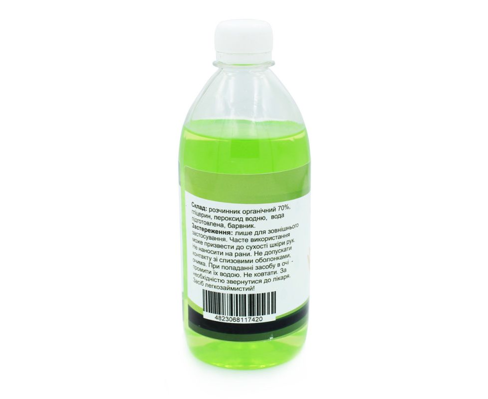 Засіб косметичний для очищення рук (антисептик), для швидкої дезінфекції шкіри рук.Ефективно захищає від вірусів та бактерій. Спосіб застосування: нанесіть дезінфікуючий засіб на долоні і розітріть до повного висихання.Склад: розчинник органічний 70%, гліцерин, перекис водню, вода підготовлена, барвник.Увага: тільки для зовнішнього застосування. Часте використання може призвести до сухості шкіри рук. Не наносити на рани. Не допускати контакту зі слизовими оболонками, очима.При попаданні засобу в очі - промити їх водою. Не ковтати. При необхідності звернутися до лікаря. Засіб легкозаймистий!Умови зберігання: Зберігати в упаковці виробника окремо від ліків в недоступному для дітей місці при температурі від -40 ° С до + 35 ° Сна безпечній відстані від нагрівальних приладів, відкритого вогню і прямих сонячних променів.Має відповідний Висновок державної санітарно-епідеміологічної експертизи. Термін придатності: 5 років.