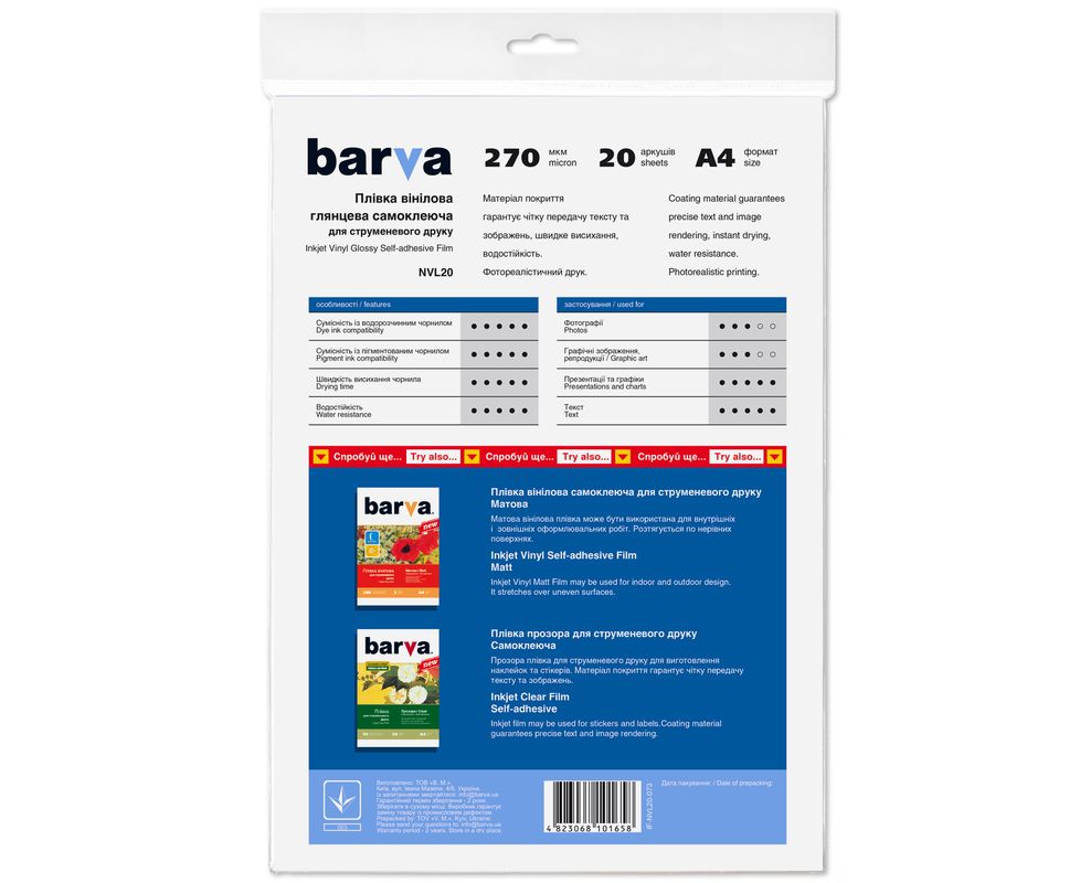 Плівки Barva підходять для друку зображень з роздільчою здатністю до 5760+ dpi. Плівка витримує температурні коливання від 10° до +30° С.